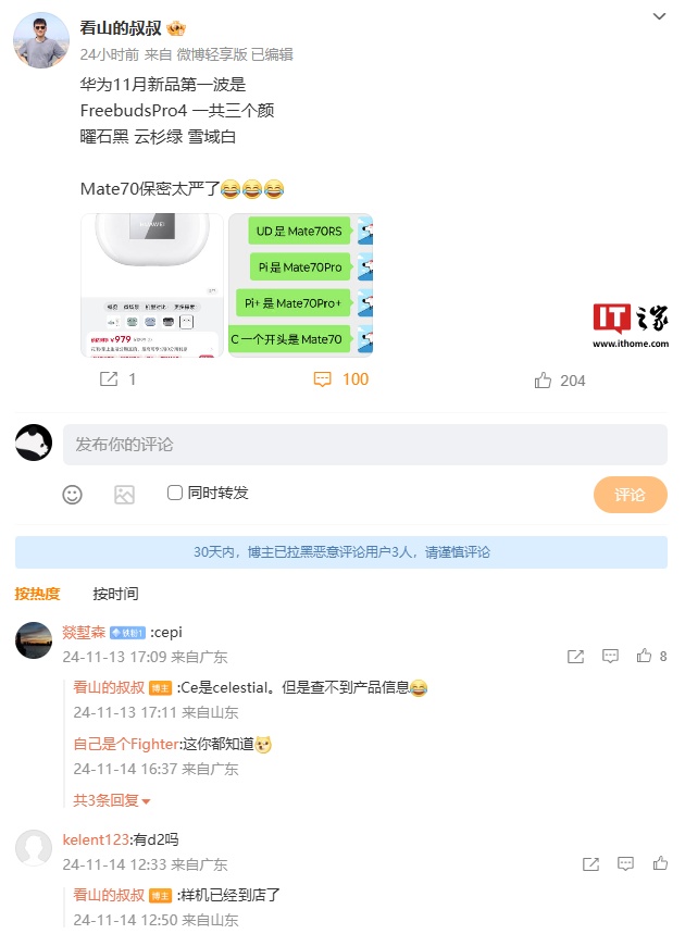 评论区中有网友询问是否有华为 WATCH D2 智能手表新品,博主回复称“样机已经到店了”。预计华为 WATCH D2 智能手表国行版将在此次新品发布会上正式亮相。