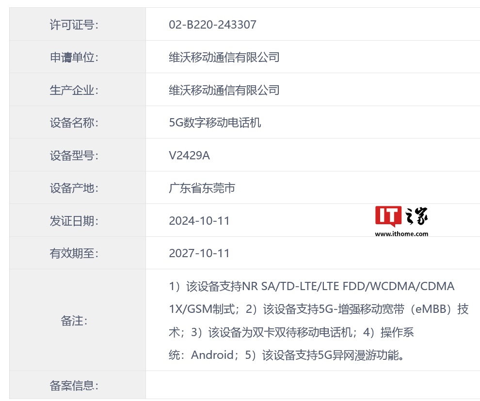 一款型号为“V2429A”的 vivo 手机于 10 月 11 日获得电信设备入网许可,根据此前 IMEI 数据库显示的信息,该机预估为 vivo X Fold 4 折叠屏手机。