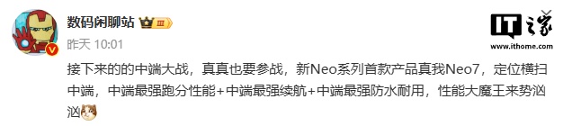博主 @数码闲聊站 昨日曾发文称,新 Neo 系列首款产品真我 Neo7,定位横扫中端,中端最强跑分性能 + 中端最强续航 + 中端最强防水耐用。