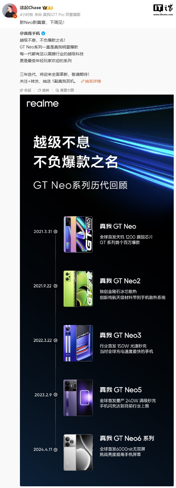 IT之家 11 月 22 日消息,realme 副总裁、全球营销总裁、中国区总裁徐起今日发文称:“新 Neo 新篇章,下周见!”,预计将公布 Neo 系列新机的最新消息。