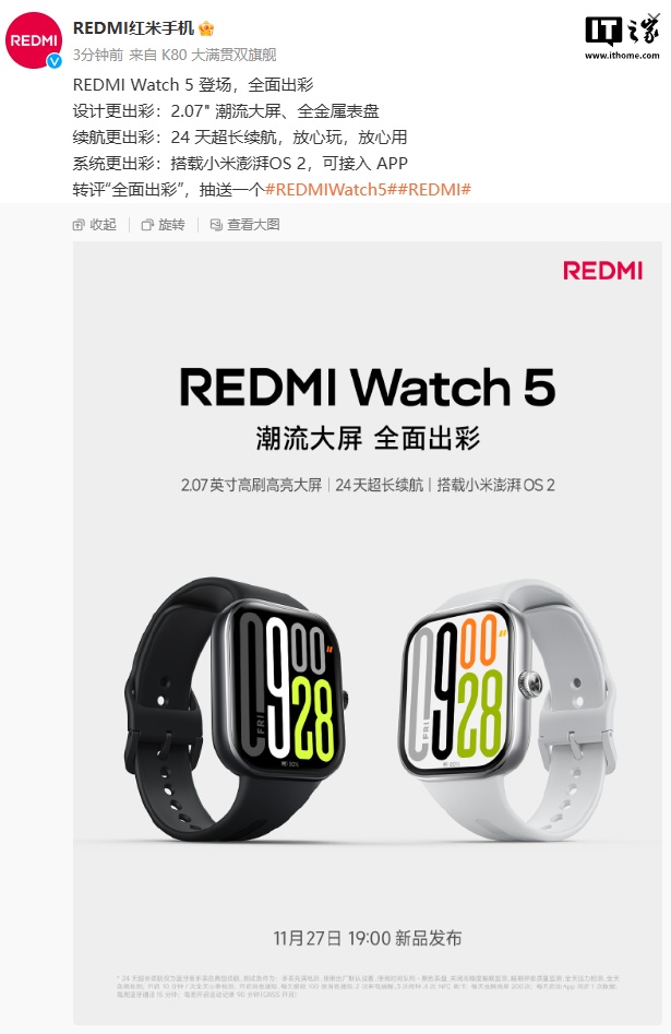 IT之家 11 月 22 日消息,小米今天下午宣布,REDMI Watch 5 手表将于 11 月 27 日 19:00 发布,新品配备 2.07 英寸方形显示屏、全金属表盘,支持 24 天超长续航,搭载小米澎湃 OS 2,可接入 App。
