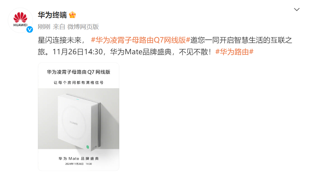 11 月 26 日 14:30,华为 Mate 品牌盛典将正式举行,除了华为 Mate70 手机,本次还将有其他值得关注的新品。比如今天,华为官方就预告了华为凌霄子母路由 Q7 网线版即将亮相 26 日华为 Mate 品牌盛典的消息。