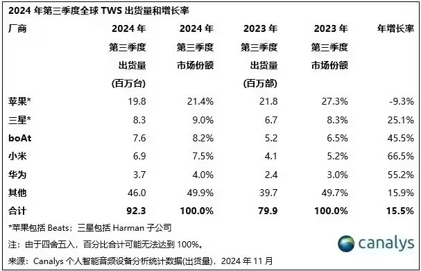 Canalys统计数据显示,今年第三季度全球TWS真无线耳机销量为9230万台,同比增长高达15.5%。与手机、PC、平板电脑等陷入瓶颈期的行业不同,TWS耳机行业仍保持着较强的活力。