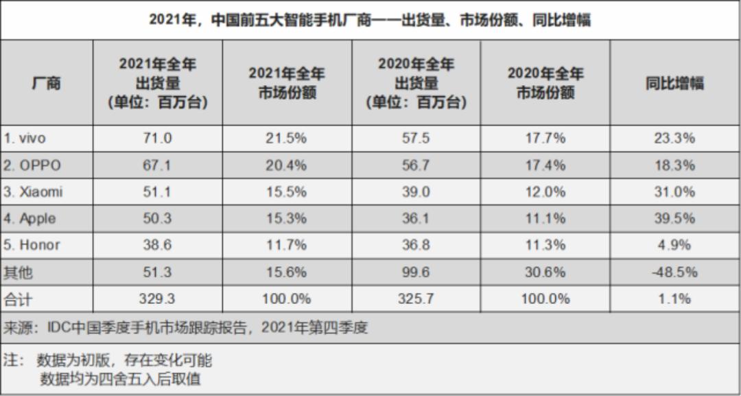 图片来源:《IDC中国季度手机市场跟踪报告,2021年第四季度》