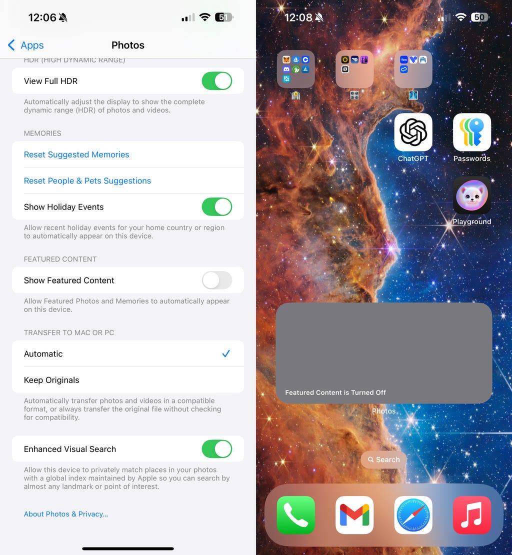 在“设置”应用中,转到应用 > 照片,然后关闭显示精选内容。这将停止设备上的所有精选内容,包括照片应用中的相册、主屏幕上的小组件和搜索中的照片。