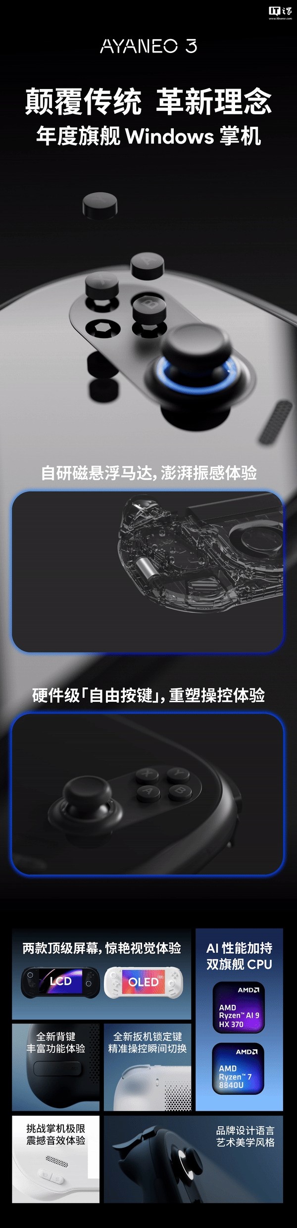 IT之家 11 月 22 日消息,AYANEO 今晚对其“年度旗舰掌机”新品 AYANEO 3 进行预热,宣布该产品将搭载磁悬浮马达和硬件级自由按键。