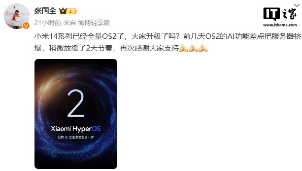 IT之家 11 月 23 日消息,小米手机系统软件部总监张国全昨晚发文确认,小米 14 系列手机已全量推送澎湃 OS 2。