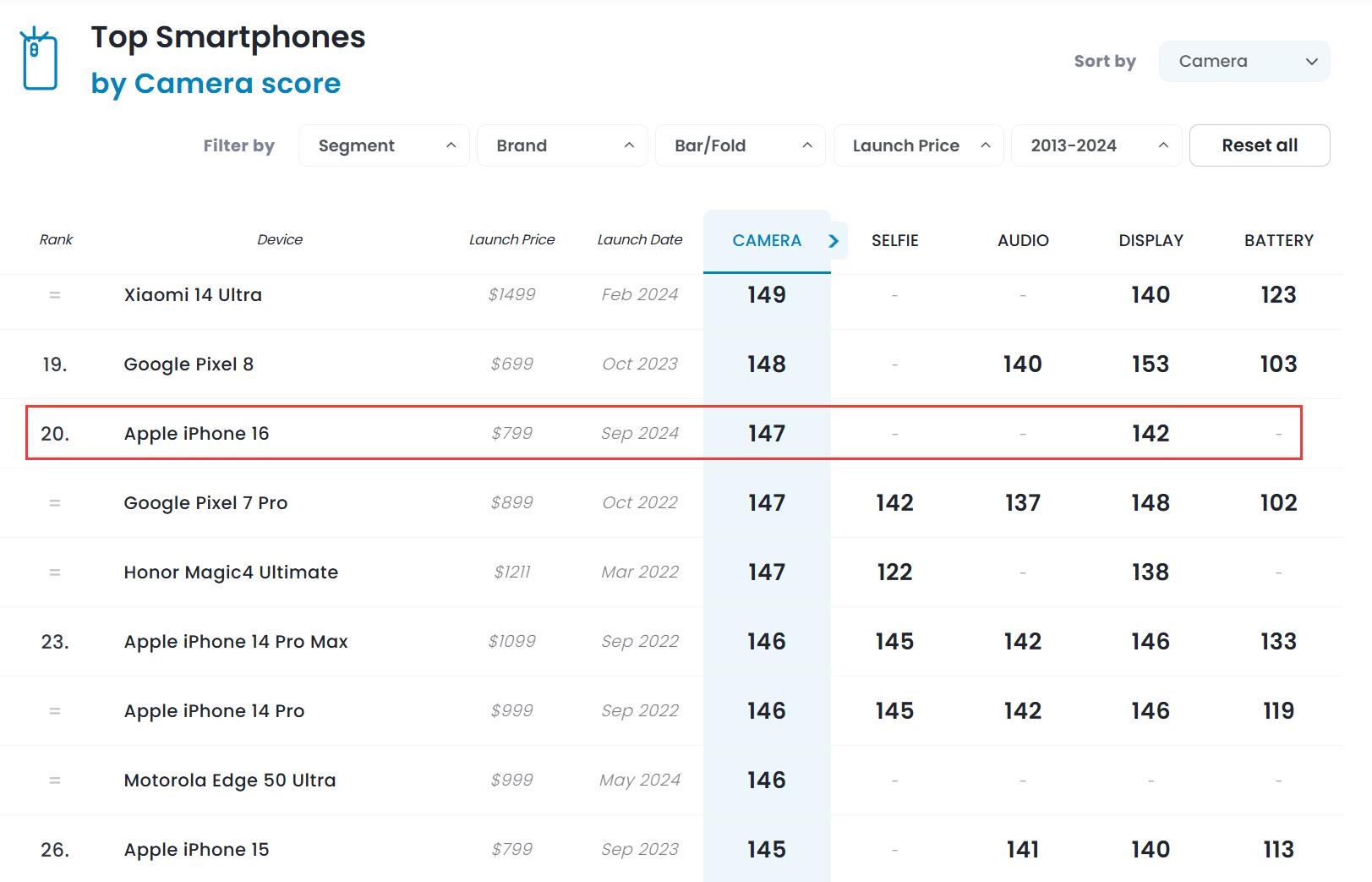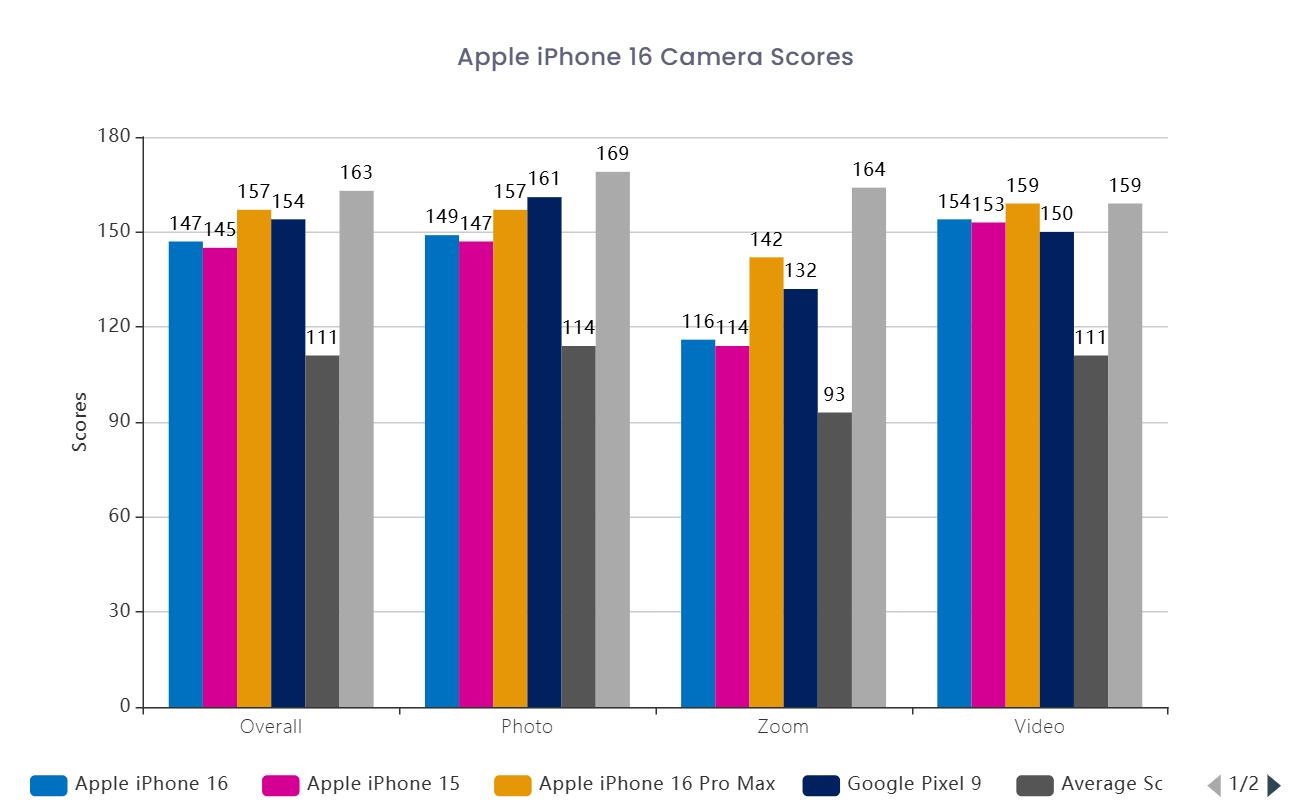 今天,DXOMARK公布了iPhone 16的影像综合成绩:147分。从排行榜来看,iPhone 16比谷歌Pixel 8低了1分,但胜过了iPhone 14 Pro Max,对比上代机型iPhone 15提升了2分。据悉,iPhone 16配备4800万像素等效26mm f/1.6主摄,支持OIS光学防抖,超广角是1200万像素,等效13mm,光圈是f/2.2,拥有120°广视野。