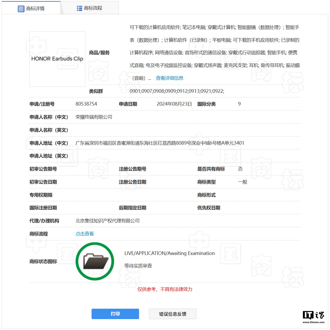 据此前报道,荣耀在今年 8 月申请一项名为“HONOR Earbuds Clip”的商标,其描述包括“首饰形式的通信设备;穿戴式扬声器;耳机;骨传导耳机”。