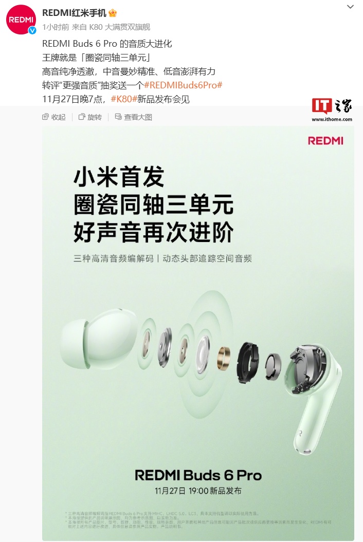 IT之家 11 月 24 日消息,小米在本月官宣将推 REDMI Buds 6 Pro 无线蓝牙耳机,该耳机将搭载“小米首款圈瓷同轴三单元”。