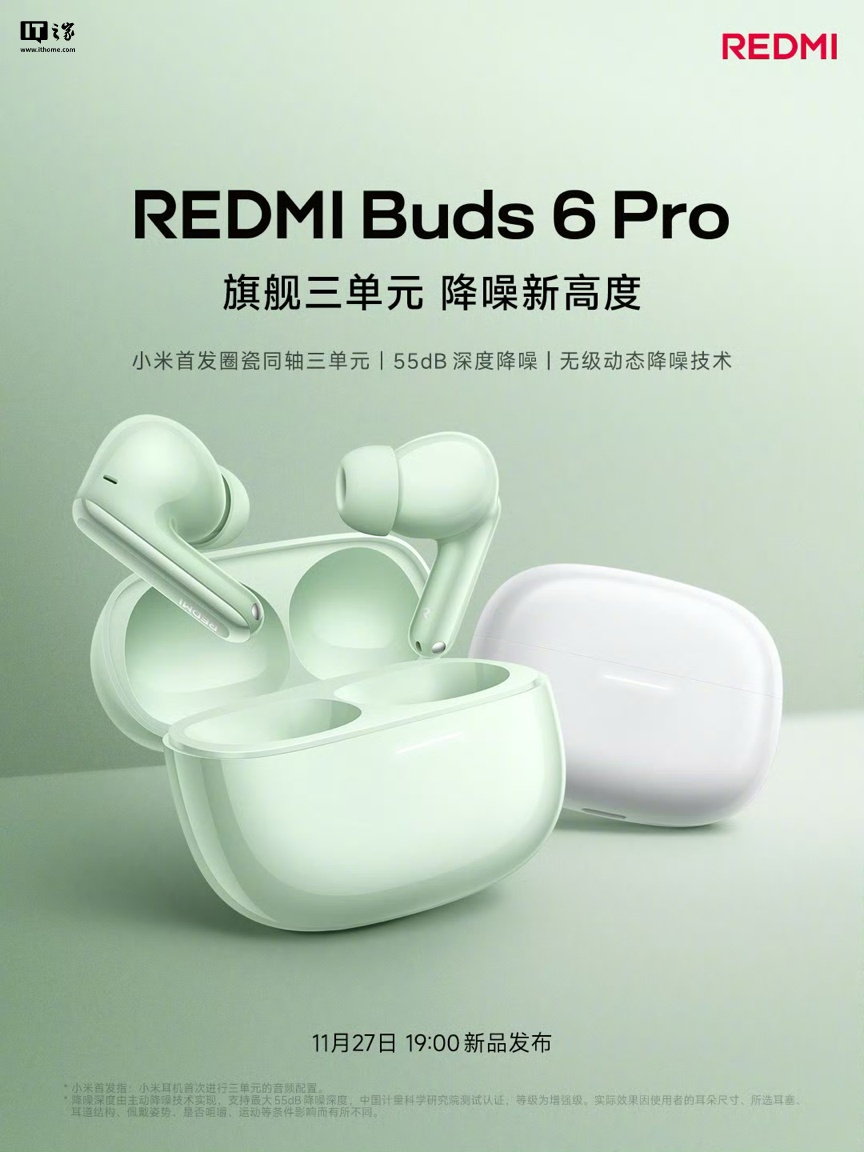 IT之家此前报道,REDMI Buds 6 Pro 将于 11 月 27 日晚发布,支持 55dB 深度降噪,配备无级动态降噪技术。