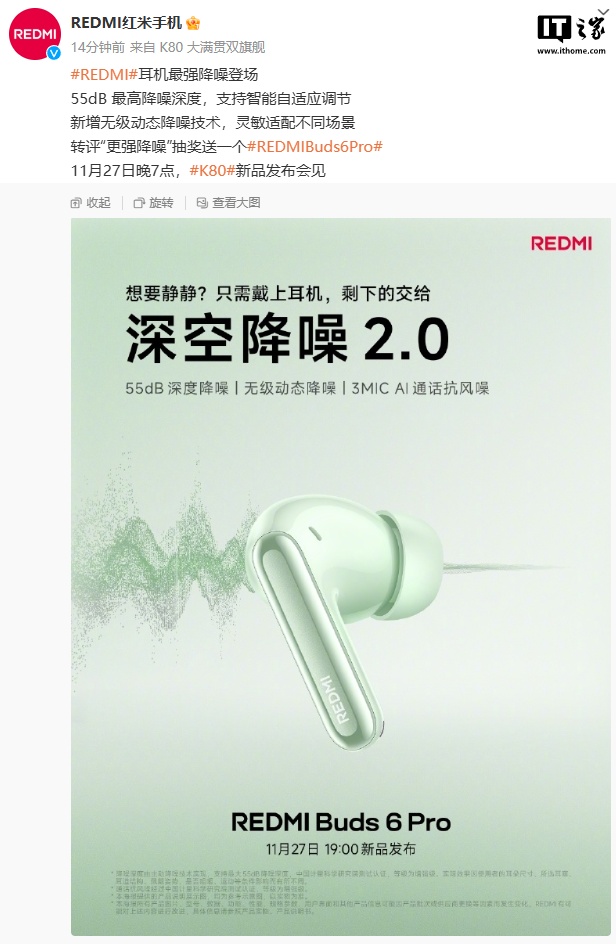 IT之家 11 月 24 日消息,小米 REDMI Buds6 Pro 耳机将于 11 月 27 日晚 7 点发布,今日官方预热显示这款新品配备 55dB 最高降噪深度,支持智能自适应调节;新增无级动态降噪技术,灵敏适配不同场景。此外,该产品还支持 3MIC AI 通话抗风噪。