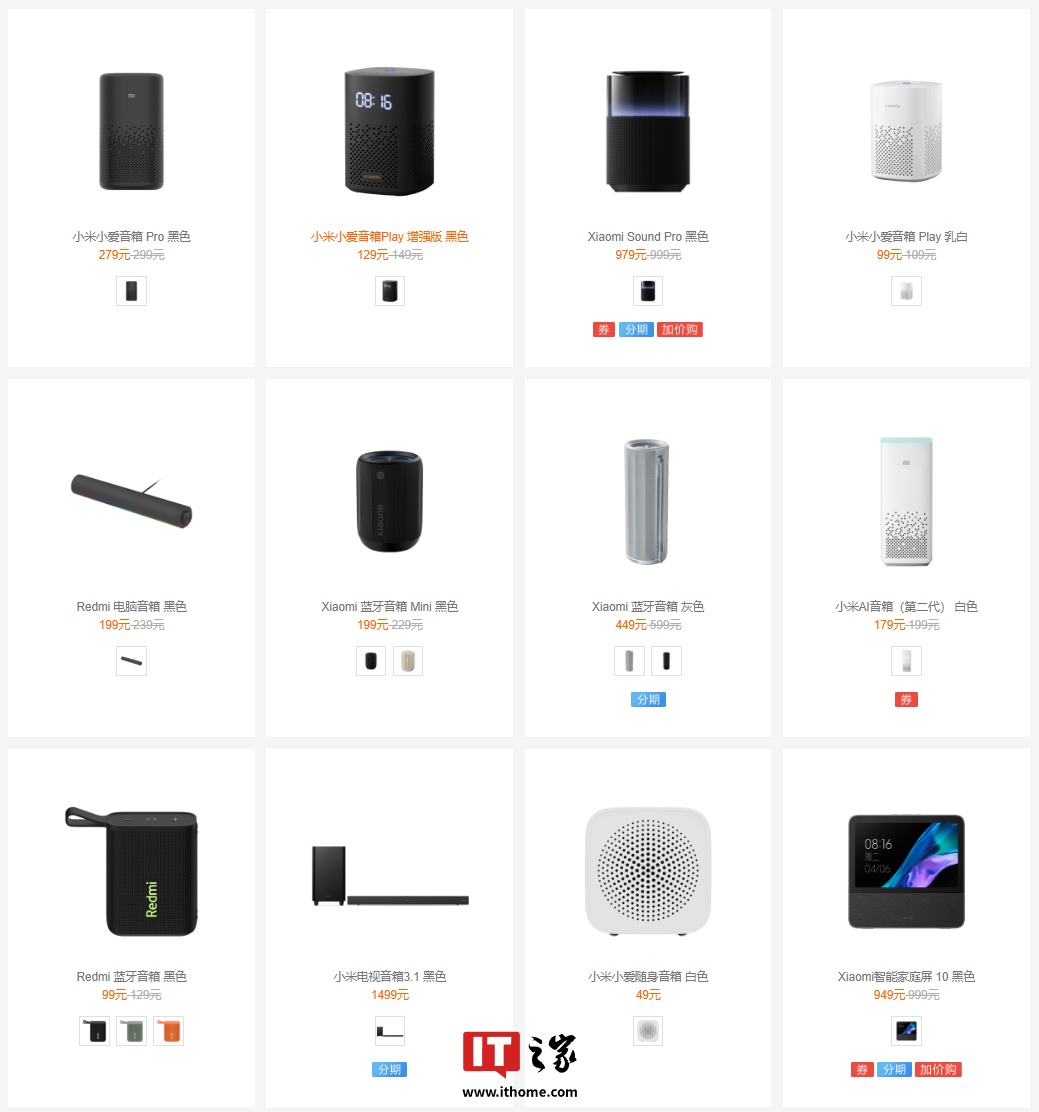 IT之家查询小米商城官网获悉,目前在售的有超 20 款音箱产品,覆盖 49 元 - 3999 元价位段。其中除蓝牙音箱外,其余品类产品基本接入小爱同学。