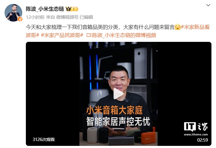 IT之家 11 月 25 日消息,小米生态链总经理陈波昨日发布视频,对小米音箱品类产品进行了梳理:产品共 4 大系列,覆盖出行和居家场景使用。