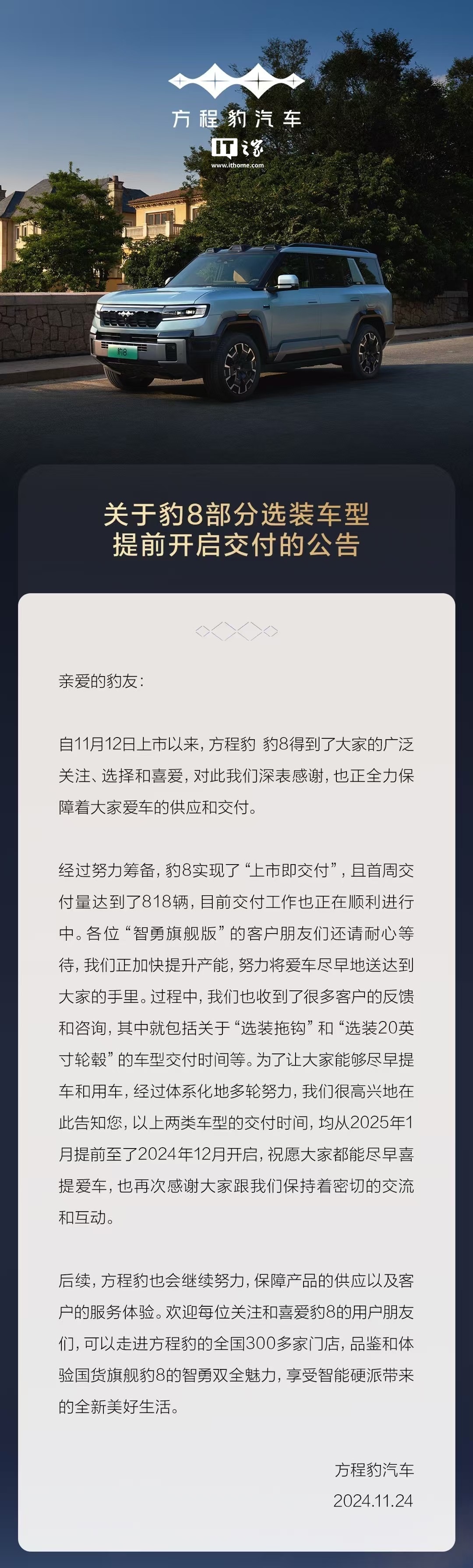比亚迪方程豹汽车官方在公告中提到,豹 8 汽车实现“上市即交付”,首周交付量达 818 辆。豹 8“选装拖钩”和“选装 20 英寸轮毂”的两款车型交付时间均从 2025 年 1 月提前至 2024 年 12 月开启。
