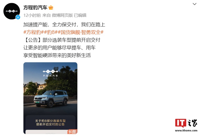 IT之家 11 月 25 日消息,方程豹汽车官方昨日晚发布公告称部分选装车型将提前开启交付,主要包括选装“拖钩”和“20 英寸轮毂”的两款车型。