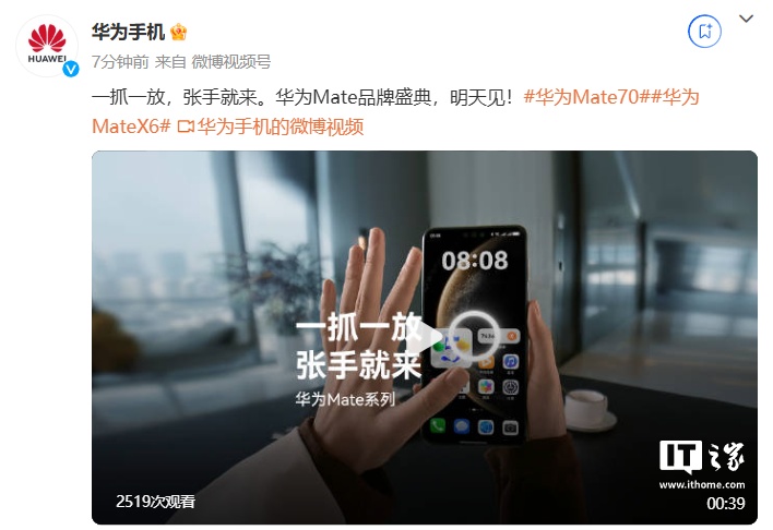 IT之家 11 月 25 日消息,华为手机官方今日发布 Mate 70 / X6 系列手机、MatePad Pro 13.2 英寸平板 2025 预热视频,展示了全新手势交互功能 / 特性。