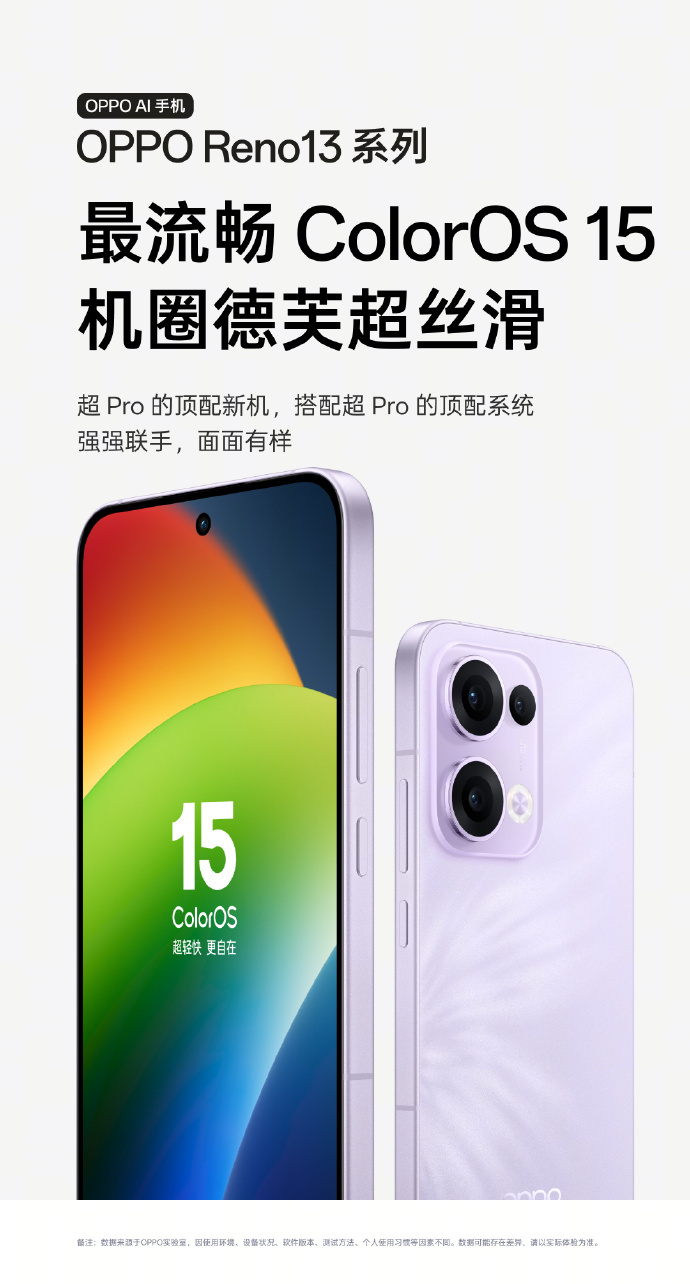 系统层面OPPO Reno13系列预装最新的ColorOS15系统,给用户德芙般流畅丝滑的使用体验,好几年还能流畅如新。ColorOS15流体云可以把服务信息在顶部居中显示,让用户不错过任何重要信息。一碰互传功能也是目前安卓阵营唯一的,拖图片、实况的文件的传输更容易。加上全新灵感主题的封面画报、可自由调节的双浮窗以及无所不知的一键问屏功能,OPPO Reno13系列的综合体验几乎没有短板。