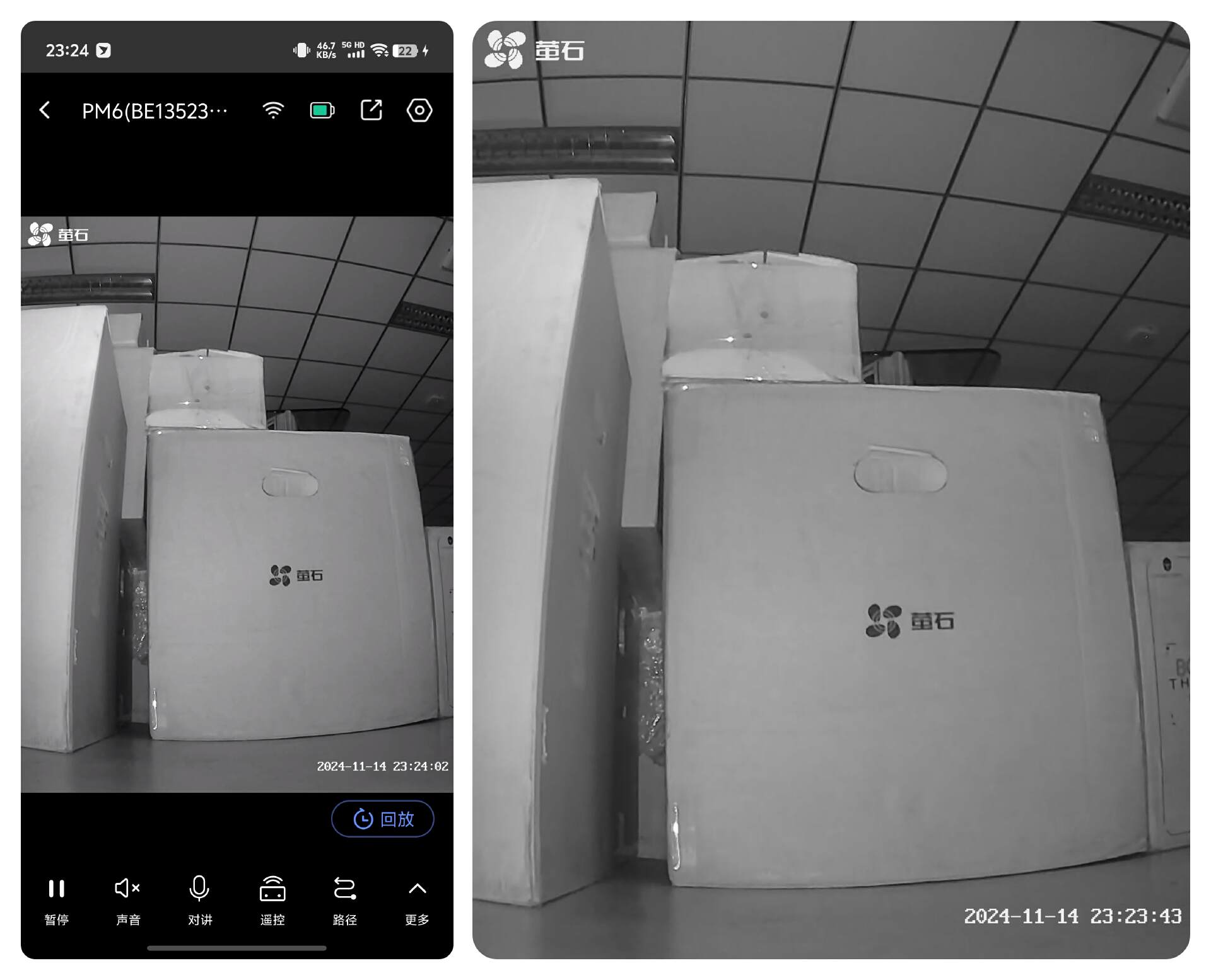 就画质来讲,萤石 TAMO 的 300 万像素够用,如下图所示,笔者截图了晚上室内关灯环境下的照片,在这种伸手不见五指的环境下,萤石字样依旧清晰可见。