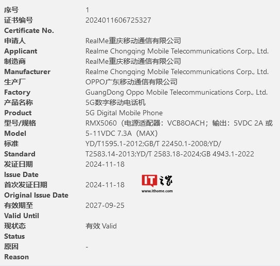 据IT之家此前报道,realme 真我 Neo 7 手机已通过国内 3C 认证,信息显示搭配 VCB8OACH 充电器,支持 5VDC 2A 或 5-11VDC 7.3A(最大 80W)快速充电。
