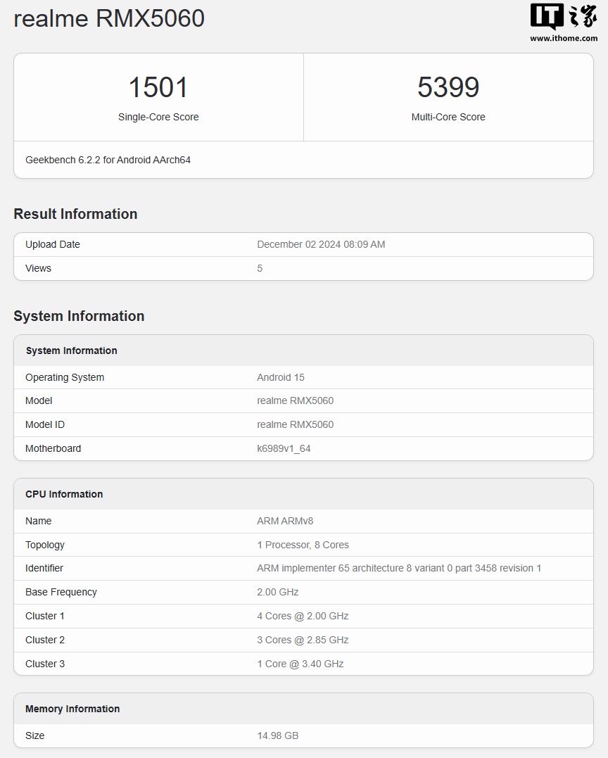 跑分平台数据显示,realme 真我 Neo7 手机其中一次测试单核得分 1501 分、多核多分 5399 分,预装安卓 15 系统、拥有 16GB 运行内存。