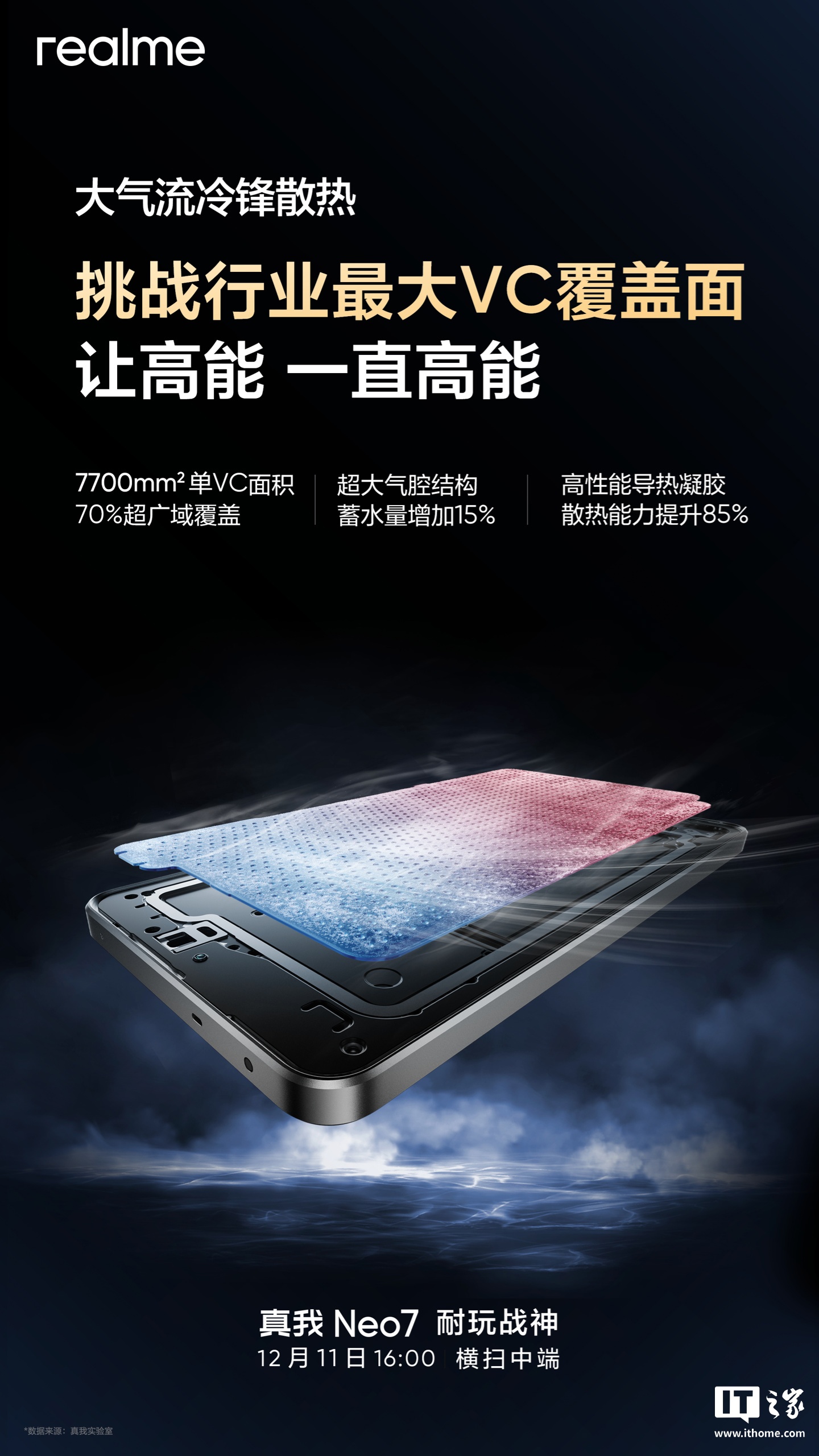 IT之家 12 月 3 日消息,realme 真我 Neo7 手机将于 12 月 11 日 16:00 发布,新机已确定搭载联发科天玑 9300+ 芯片、首发 7000mAh 泰坦电池、拥有 7700mm² 单 VC 面积。