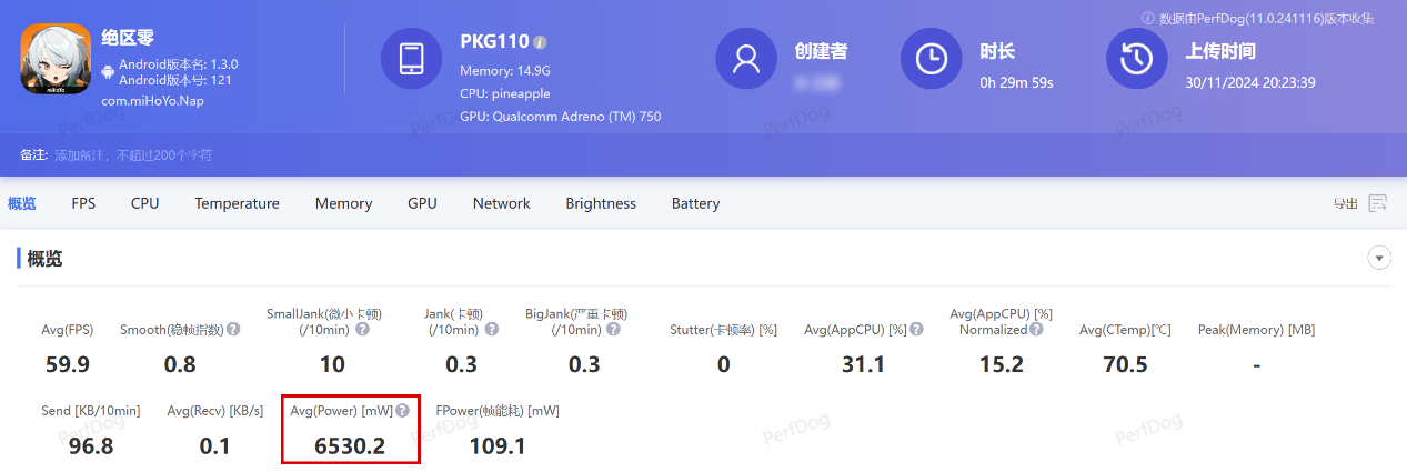 30 分钟光映广场 30 跑图后。《绝区零》的游戏帧率波动确实要比前面两款游戏都要大,但最终平均帧数也达到了 59.9 帧。