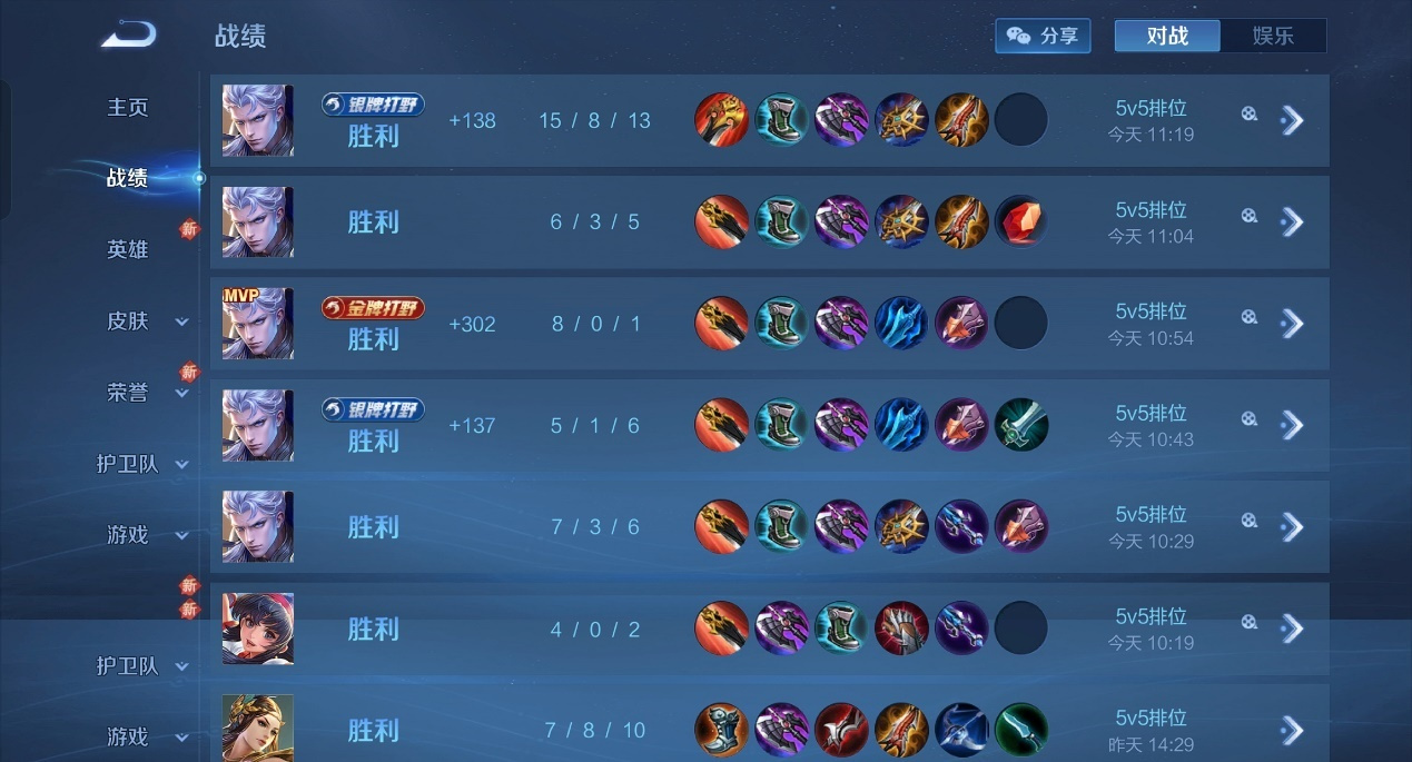 由于《王者荣耀》每局结束后脱离游戏地图时帧数会直接掉回 60 帧,对记录结果造成干扰,所以我们只记录对局中的实时帧率。从战绩图时间上看,同一天测试的 6 局对战实际游戏时间已经超过了 1 小时。