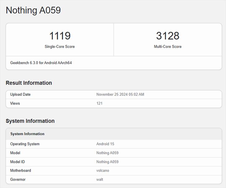 Nothing Phone 3a(代号 asteroids,型号 A059):主打中端市场,搭载骁龙 7s Gen 3 芯片组,Geekbench 6 单核跑分 1119,多核跑分 3128。