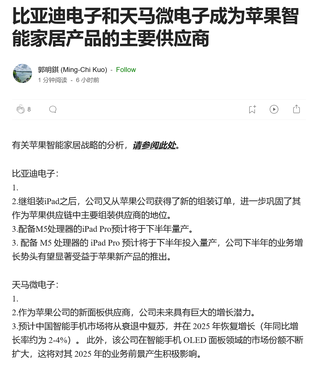 据苹果供应链分析师郭明錤称,配备苹果下一代 M5 处理器的 iPad Pro 预计将于明年下半年投入量产。郭明錤在一条帖子中写道,M5 iPad Pro 的主要装配商将是中国的比亚迪电子公司,该公司也将是苹果即将于 2025 年底发布的配备显示屏的 HomePod 的独家装配商。