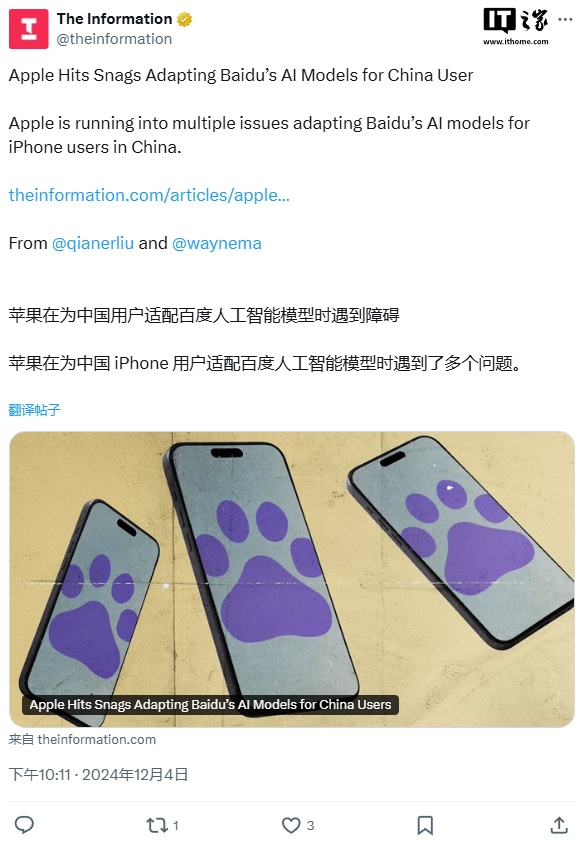 IT之家 12 月 4 日消息,The Information 报道称,苹果在为中国 iPhone 用户适配百度 AI 模型时遇到了困难。