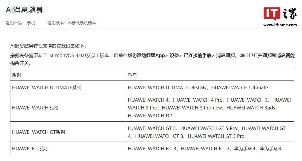 华为官网现更新了 AI 消息随身功能穿戴类设备适配情况,IT之家附详情如下: