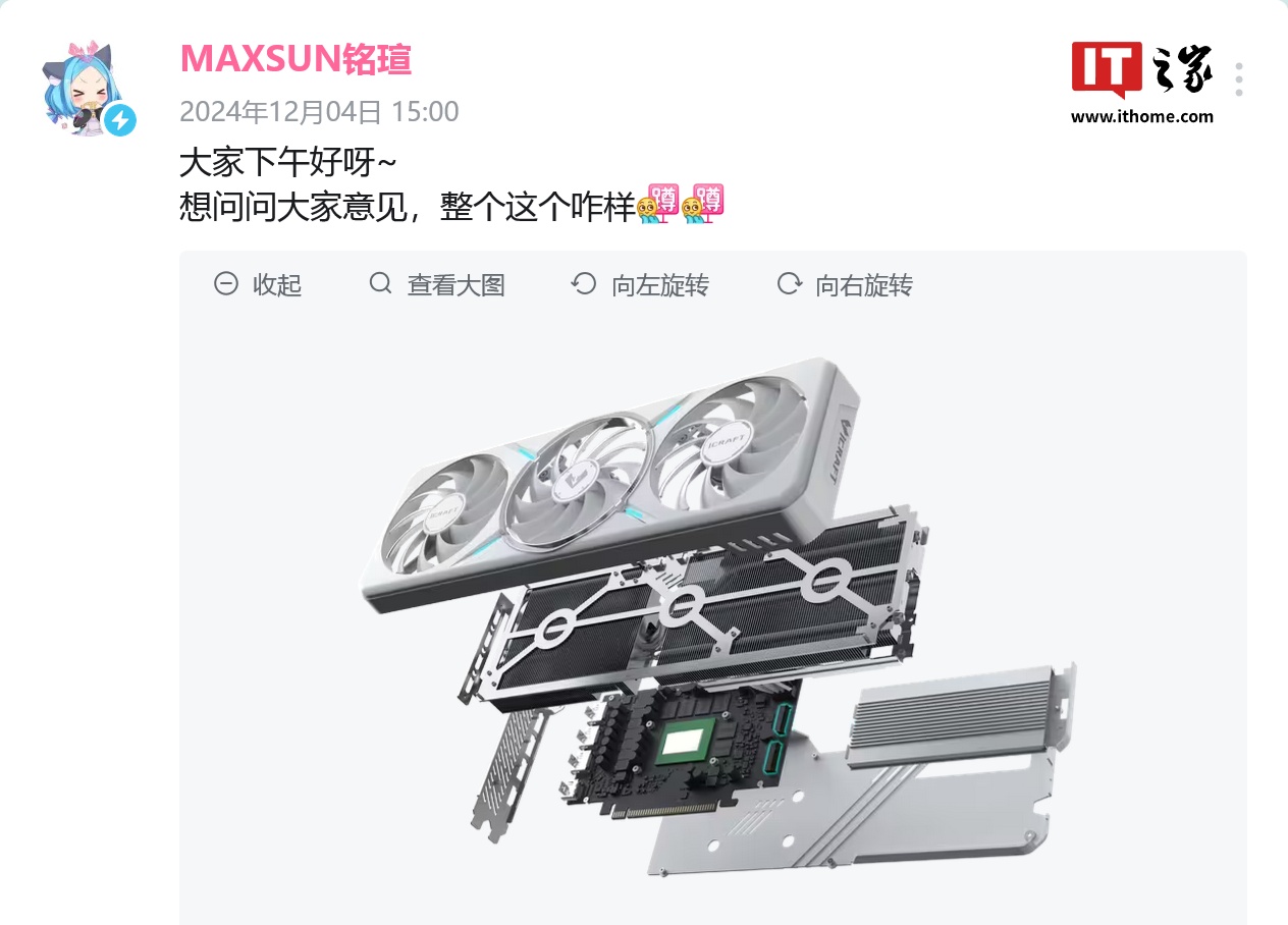 IT之家 12 月 5 日消息,MAXSUN 铭瑄B站官方账户昨日发布动态,就一款显卡设计征求意见: