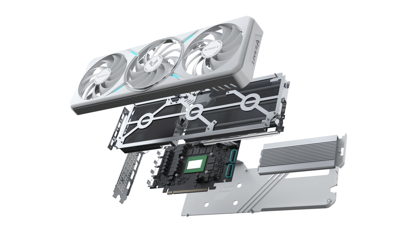 整体来看铭瑄概念显卡设计与其前日推出的英特尔锐炫 B580 iCraft 12G 较为相似,不同之处在于概念显卡疑似 M.2 接口位置后方拥有额外散热模组,或可起到辅助 M.2 SSD 散热的作用。
