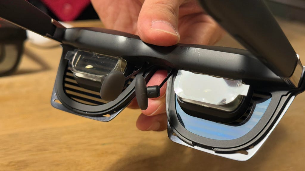 Xreal One Pro的扁平棱镜镜头仍然与“普通”眼镜有很大不同,但显示系统正在变得更加紧凑。Scott Stein/CNET