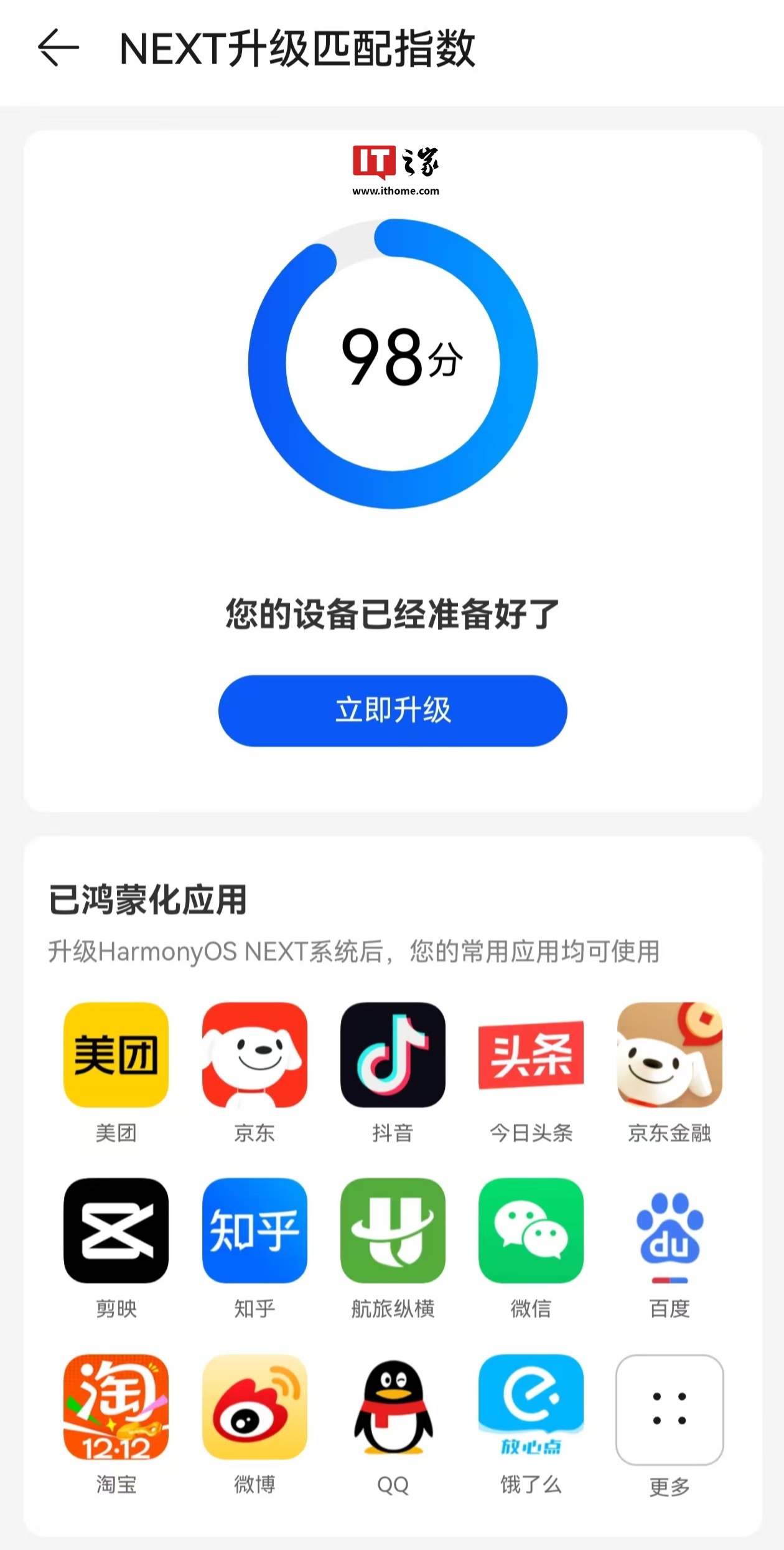 IT之家实测,该功能入口位于“我的”-“常用服务”-“鸿蒙升级”处。对于支持升级 HarmonyOS NEXT 的设备机型,点击可跳转到升级指数页面查看应用适配情况,适配情况会以百分比形式展现。