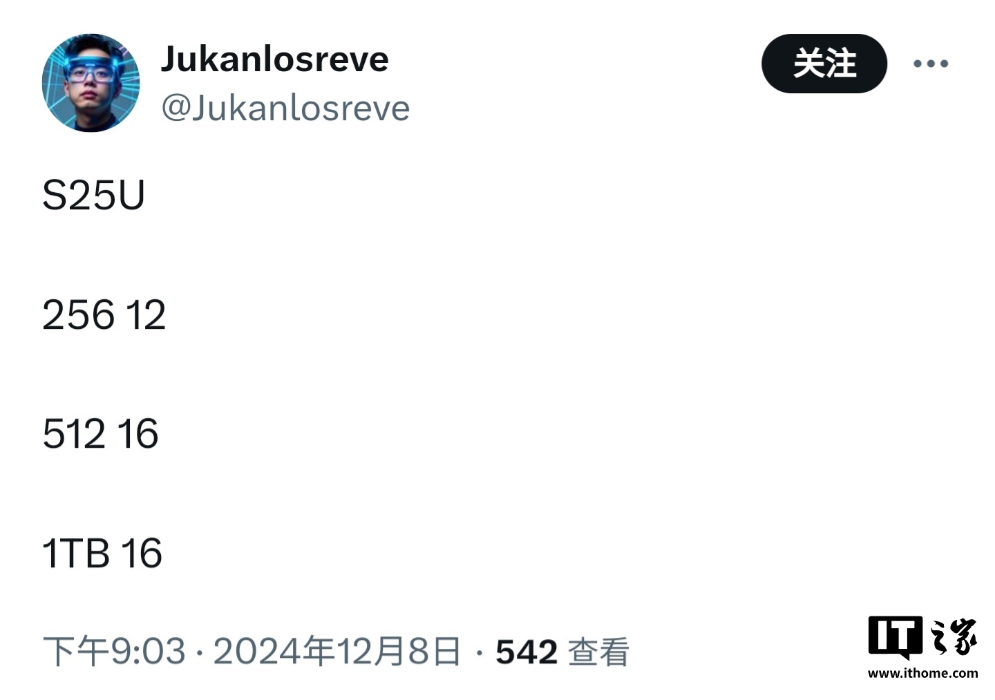 IT之家 12 月 8 日消息,消息源 @Jukanlosreve 今日曝光了三星 Galaxy S25 Ultra 手机存储规格,分别为 12GB+256GB、16GB+512GB、16GB+1TB。
