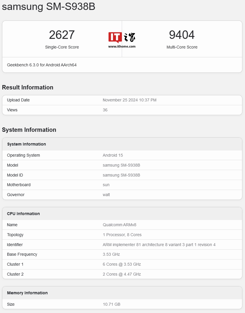 IT之家查询 GeekBench 跑分库,还发现了三星 Galaxy S25 Ultra 手机的最新跑分成绩,搭载高通骁龙 8 至尊版 for Galaxy 芯片,单核成绩为 2627 分,多核成绩为 9404 分。