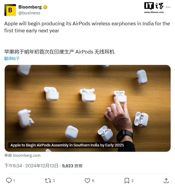 IT之家 12 月 13 日消息,彭博社今日报道称,苹果 AirPods 将于明年第一季度首次开始在印度进行组装生产,地点为中部特伦甘纳邦海德拉巴附近的一家富士康新工厂。