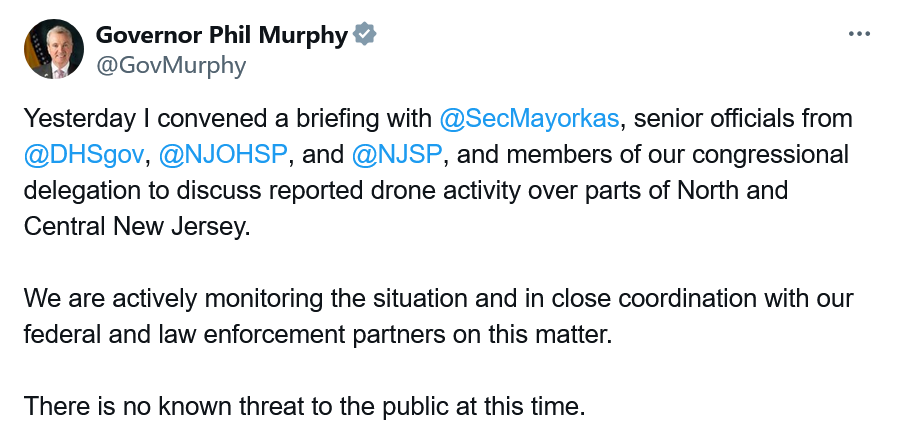 随着目击事件的不断增加,要求官员采取果断行动的压力也越来越大。 州长菲尔-墨菲(Phil Murphy)表示,如果无人机的来源仍然不明,联邦军队可以将其击落。 同时,他也在努力安抚公众,强调目前并不存在可信的威胁。