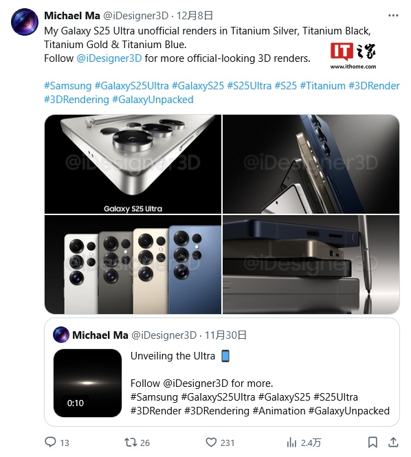 IT之家注意到,消息源 @iDesigner3D 于 12 月 8 日在 X 平台发布推文,分享了三星 Galaxy S25 Ultra 手机的高清渲染图,展示了钛银、钛蓝、钛黑和钛金四种颜色。