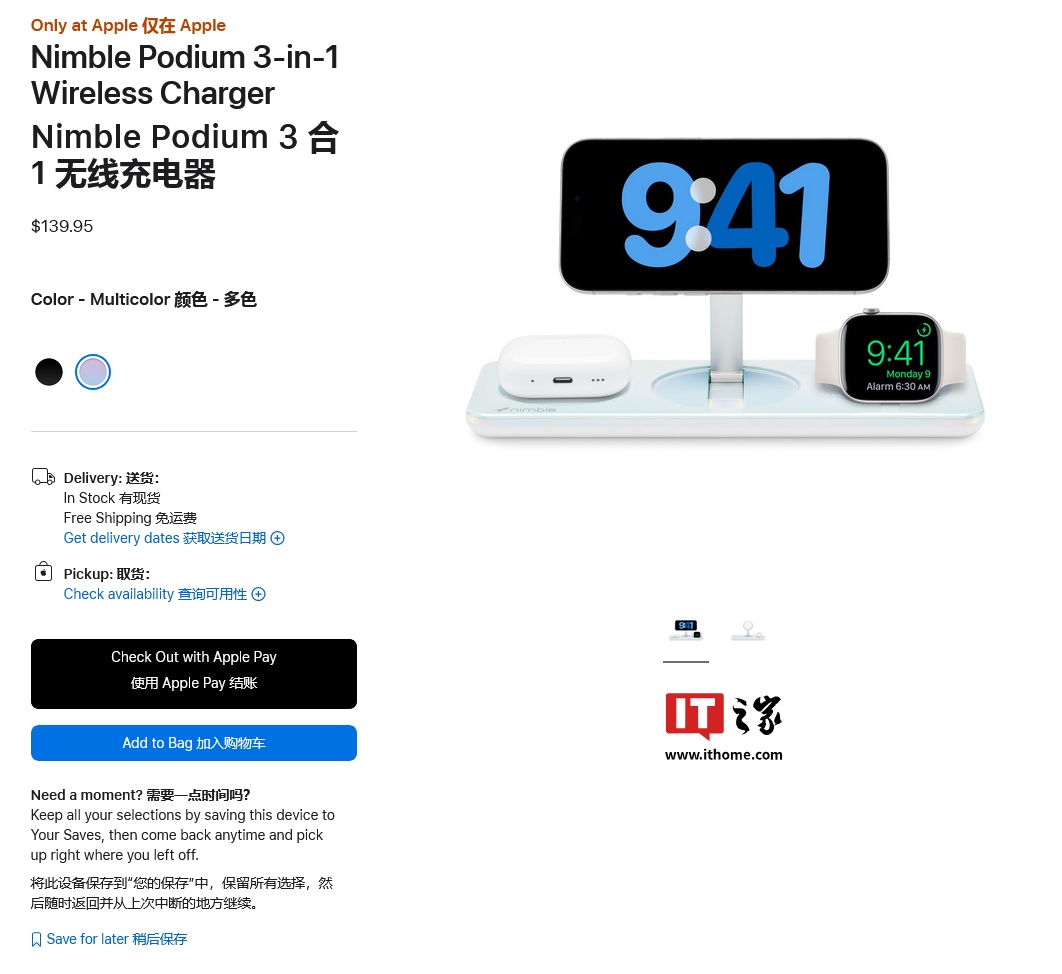 这款充电器可以为 iPhone、Apple Watch 和 AirPods 充电,售价 139.95 美元(当前约 1018 元人民币),有黑色或蓝白相间的多色可选,由回收塑料和铝制成。