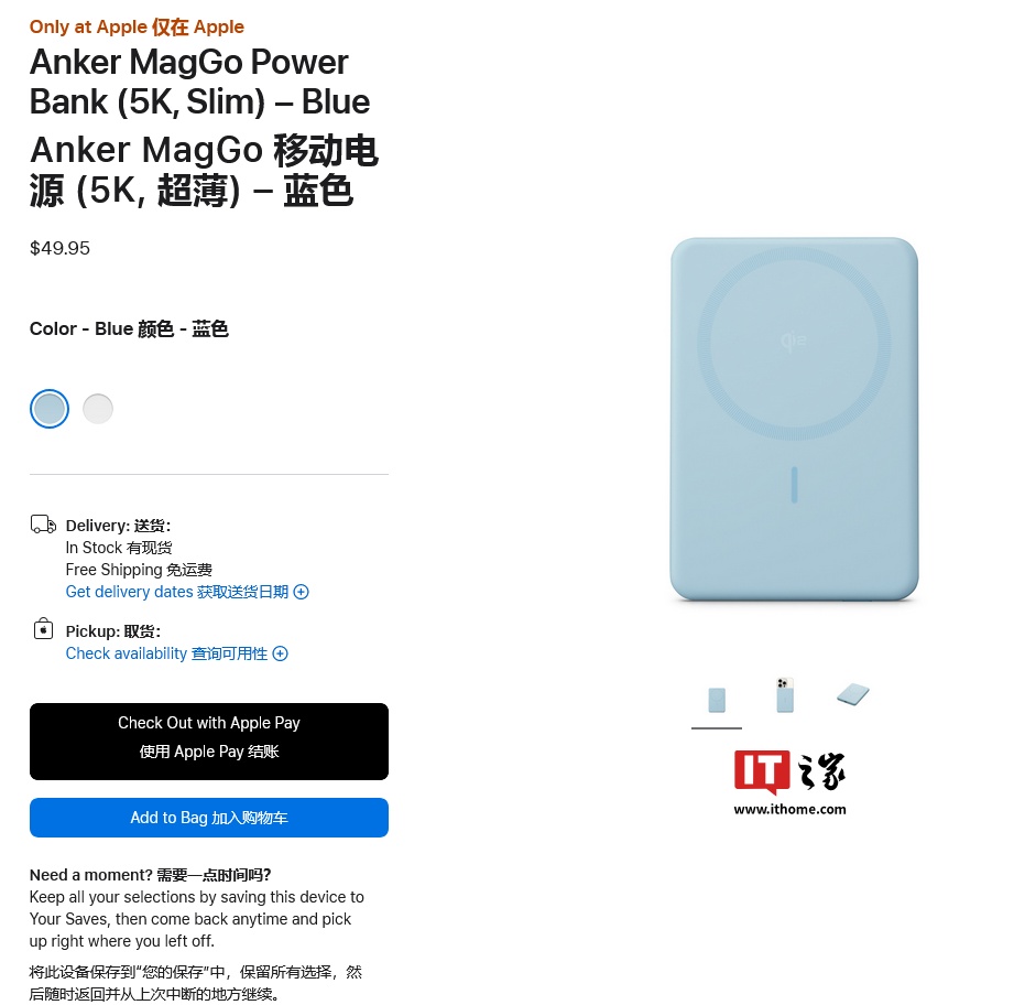 Anker MagGo 移动电源售价 49.95 美元(当前约 363 元人民币),有蓝色和白色可选。