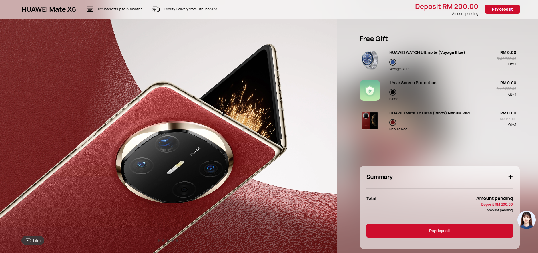 预订页显示,购买华为Mate X6将赠送价值2299RM(约合3759元人民币)的一年碎屏保和199RM(约合325元人民币)保护壳,以及价值3799RM(约合6211元人民币)的华为Watch Ultimate非凡大师智能手表,款式为纵横海洋。