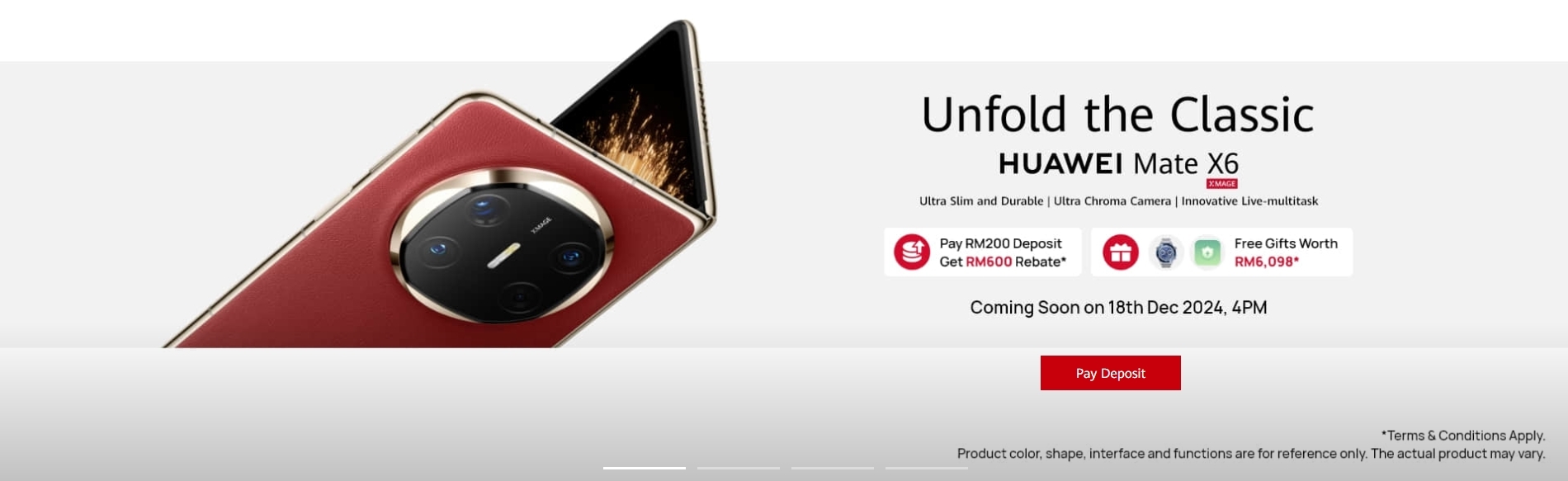 继迪拜后,华为将于12月18日在马来西亚举办发布会,主角依然是华为Mate X6和华为nova 13系列。目前,华为Mate X6已在华为马来西亚官网开启预订,订金200RM(马来西亚林吉特),约合327元人民币。