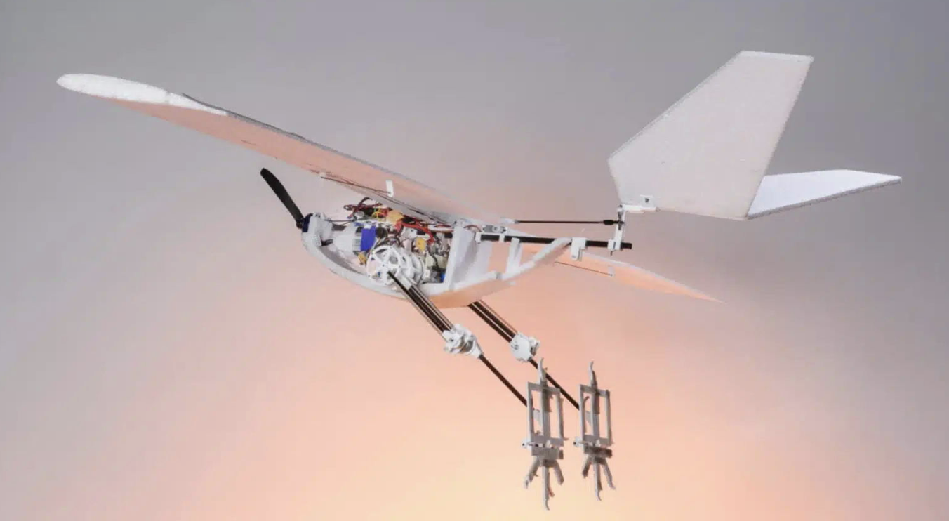 在目前设计方案中,这一仿生机械腿重量约 230 克,采用两段式设计,踝关节中配有扭转弹簧,模仿了鸟腿中的能量储存和释放机制,当无人机的腿“蹲下”时,能量便会储存在弹簧中,当腿“伸展”时,弹簧便会释放,同时与协同电机产生极高加速度,便于无人机实现瞬时弹跳升空起飞。