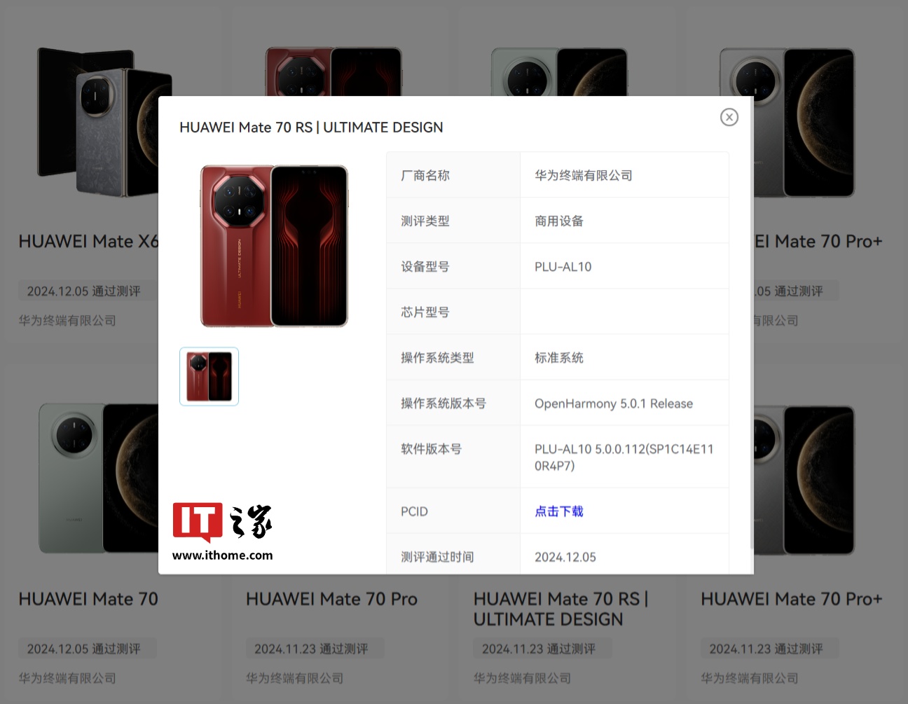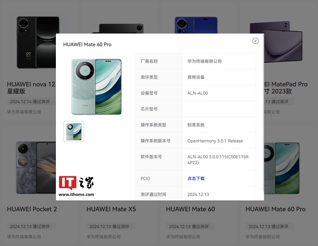 IT之家 12 月 15 日消息,华为 Mate 60 系列、Mate X5、Pocket 2、nova 12 Ultra 系列、MatePad Pro 13.2 英寸 2023 款、MatePad Pro 11 英寸 2024 款等机型分别于 12 月 13 日、14 日通过 OpenHarmony 5.0.1 Release 认证,相关页面显示软件版本号为“5.0.0.115”。