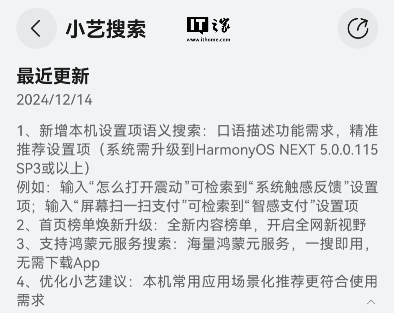 另外,纯血鸿蒙版小艺搜索 App 昨日获推“2.1.1.300”版本更新,其更新日志显示新增的“语义搜索”功能需升级至 HarmonyOS NEXT 5.0.0.115 版本,由此来看,预计上述机型近期将获推此版本升级。