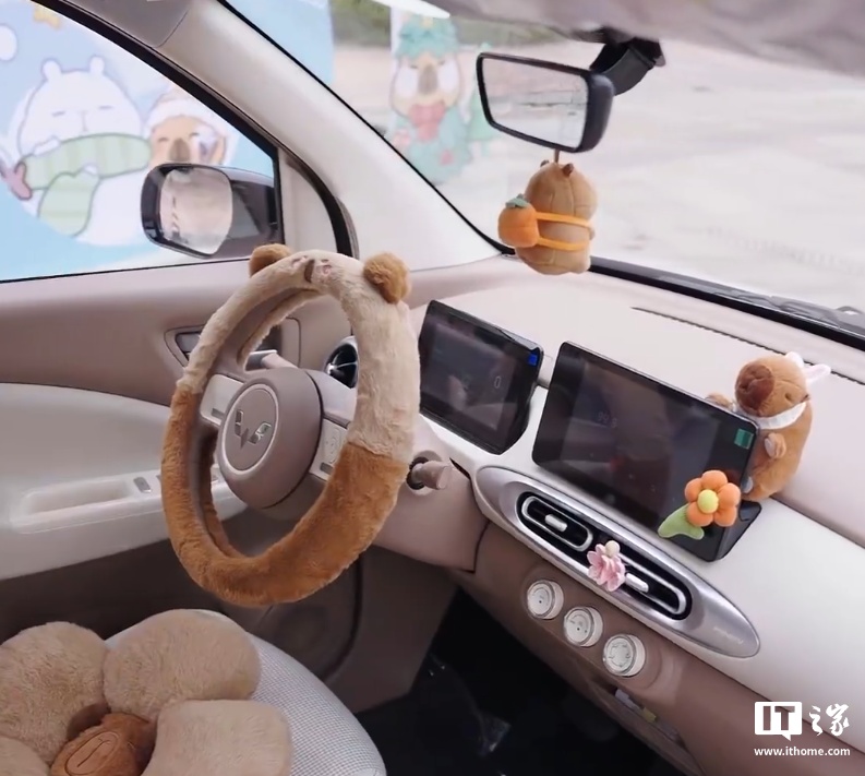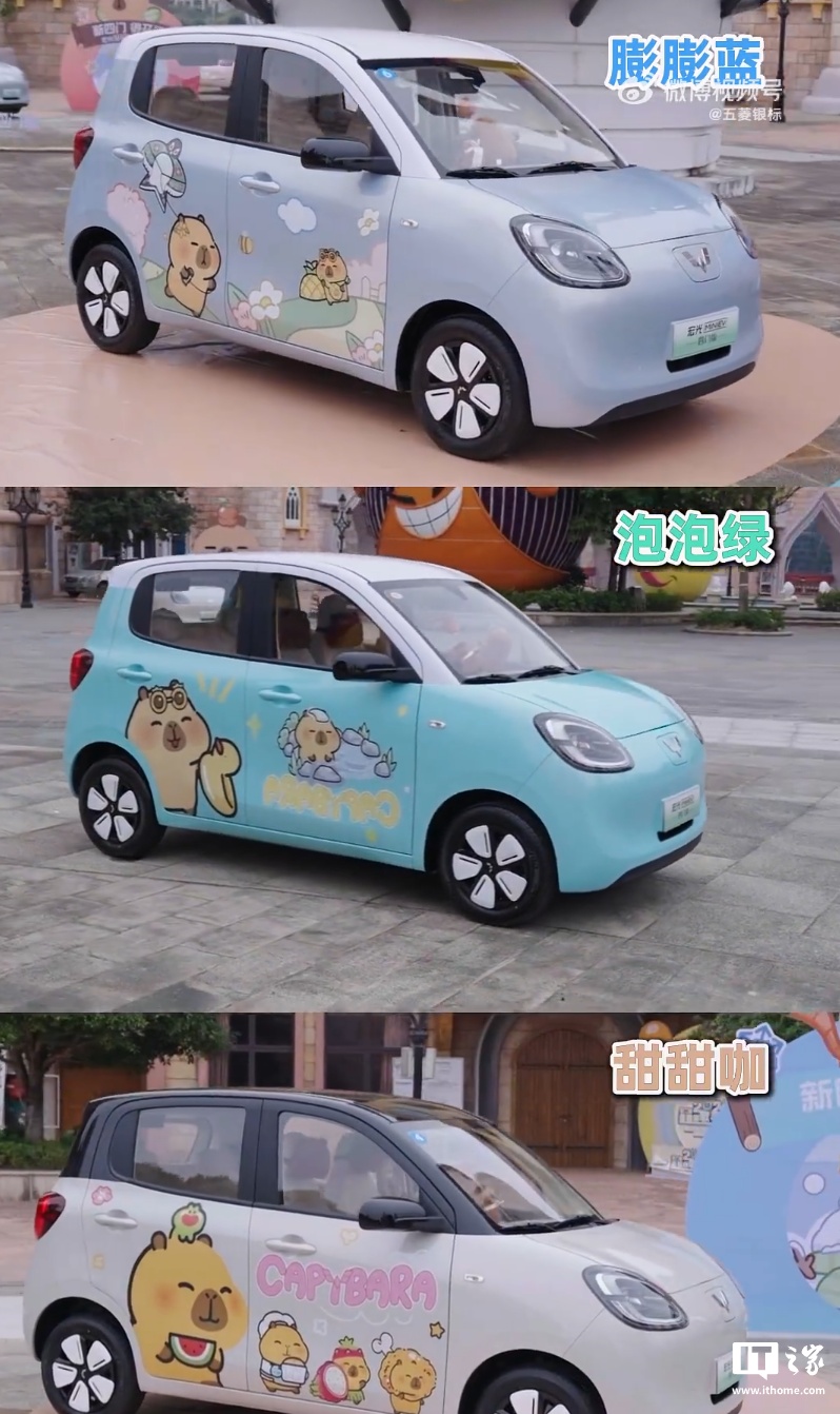 视频中,这款卡皮巴拉小黄豚联名新车,采用“微笑”前脸搭配灵动的“菱之翼”LED 灯组和“紫荆花”13 寸轮毂,一共三款幻彩高定车色:膨膨蓝、泡泡绿、甜甜咖。内饰采用全新“焦糖奶油”配色,以浅浅的巧克力棕色为主色,搭配奶酪白色进行点缀。