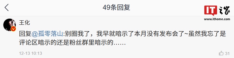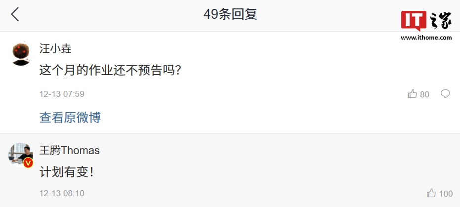 IT之家注意到,王腾本月(12 月 13 日)发布的微博评论区中,他本人明确表示 12 月最后一份作业“计划有变”。另外,小米公关部总经理王化也在评论区中回复称“我早就暗示了本月没有发布会了”。
